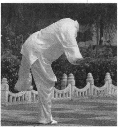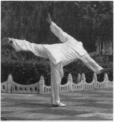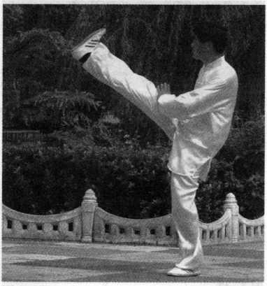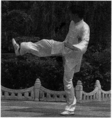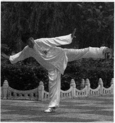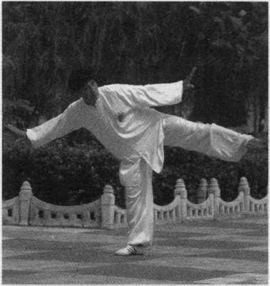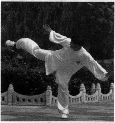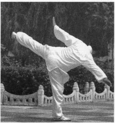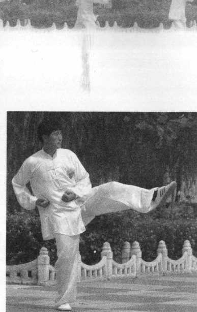 右脚下落复向上掀,两手左右 展开,右脚下落,身向左转,左脚 向左掀起两手平分(图3-53、3- 54、3—55、3—56、3—57、3—58示)。