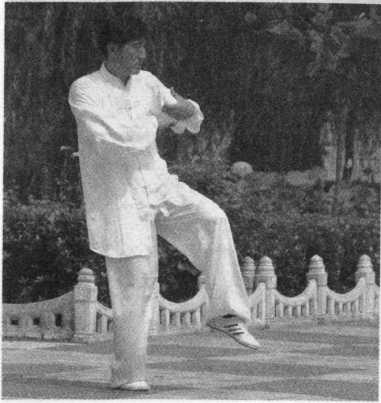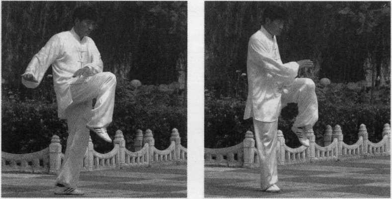 左脚落地成左虚步,两手收于 胸前,左脚略上步,提右膝,双手 向下方捋,右脚落地,提起左膝, 双手向左下方采(图3—59、3—60、 3—61、3—62 z5)o