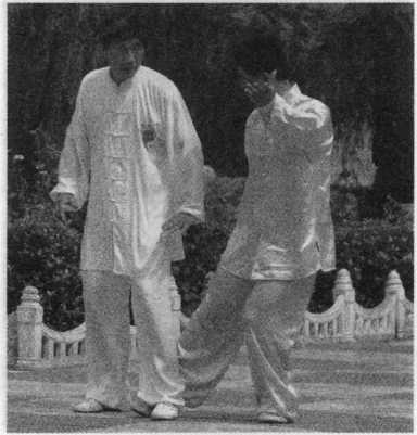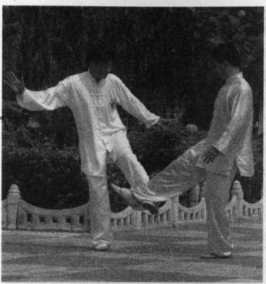 甲右手从下向上搠,翻腕拿乙 右手腕,左手拿乙右肘处,右脚前 采乙七寸(图3—98、3—99 zj\) o乙 从右脚踢甲(图3—100示)。