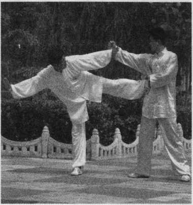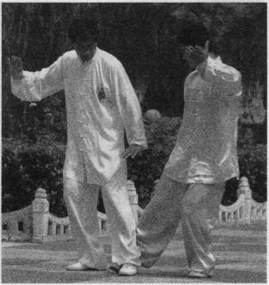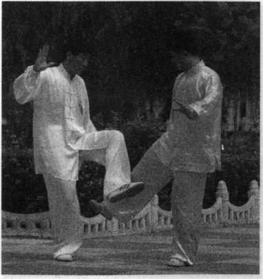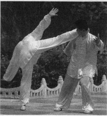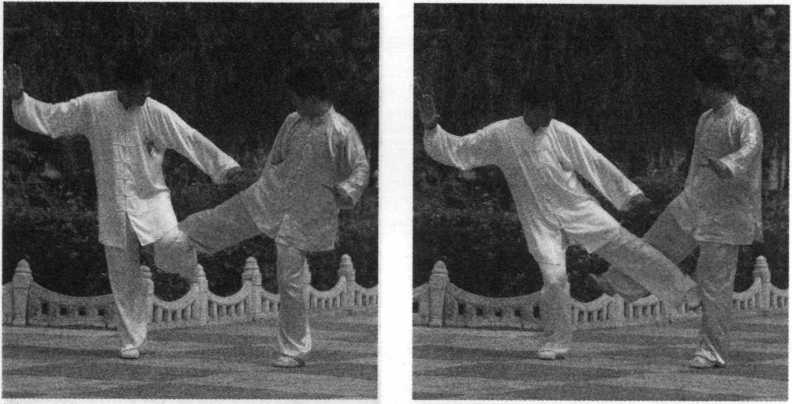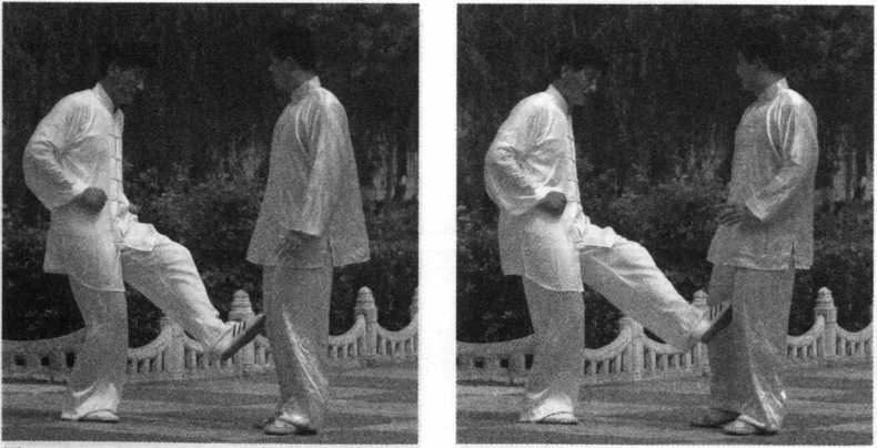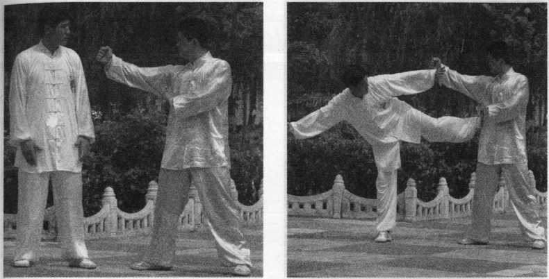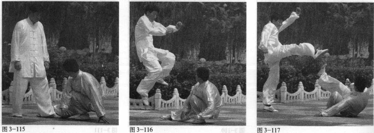 乙上右步,以右拳击甲头部 (图3—107示),甲身向右侧斜,左 手上接乙右手腕,提起左脚蹬乙肋 (图 3—108、3-109 示)。