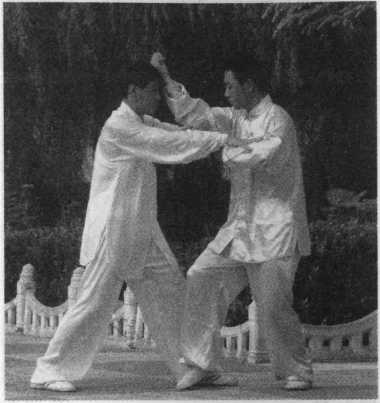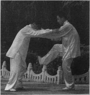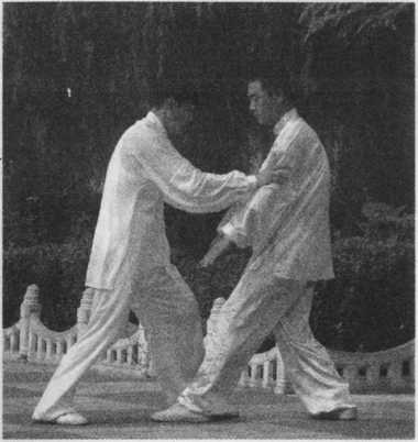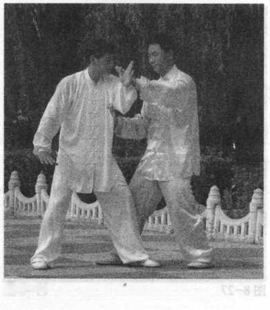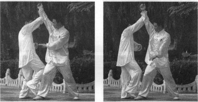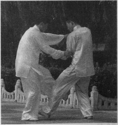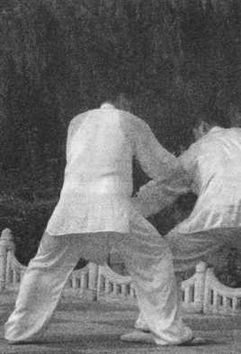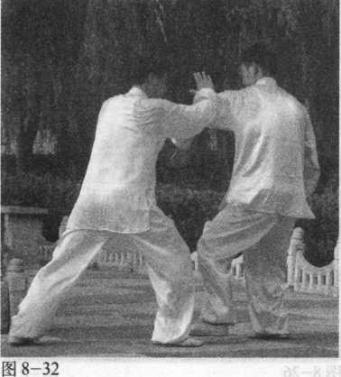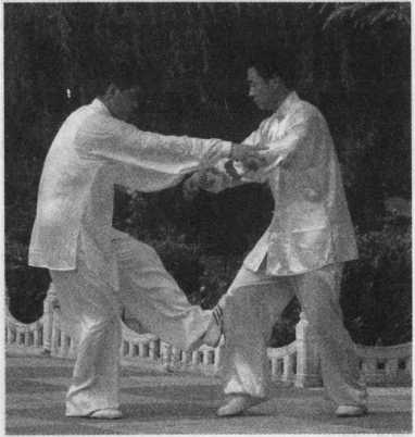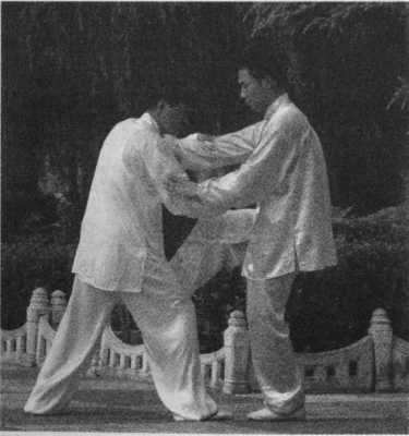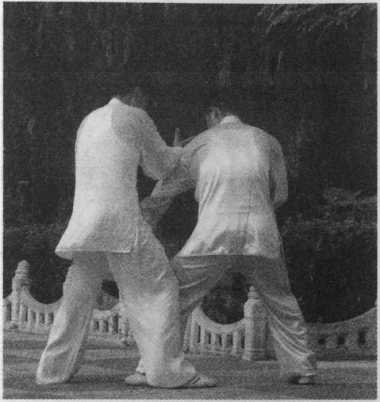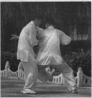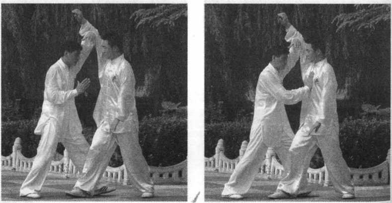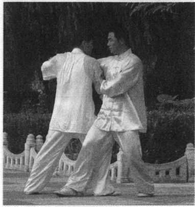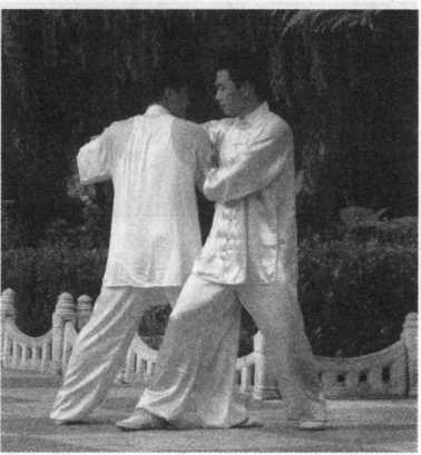 甲在乙捋劲将到未到之际,右 腿向前斜方上半步,左足插裆,左 臂横乙胸前,右手移至左臂内侧, 左肩靠乙胸。