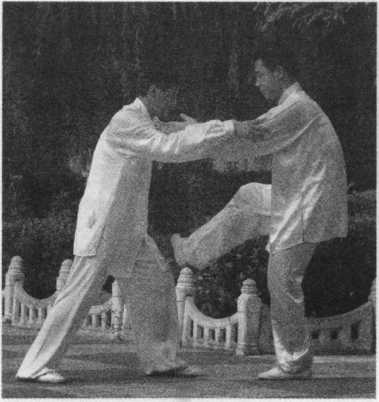 乙在甲靠劲将到未到之际,退 右步,并进左足插甲裆,双手按甲 双臂,向前按。