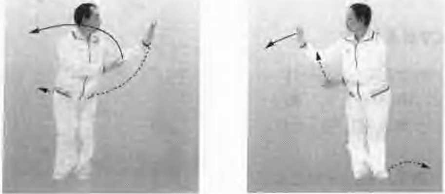 上体继续右传;右掌云至身体 右侧.掌心翻转向外;左掌玄至右 肩前,掌心翻转向内;同时左脚向
