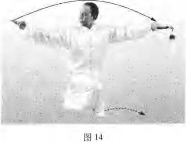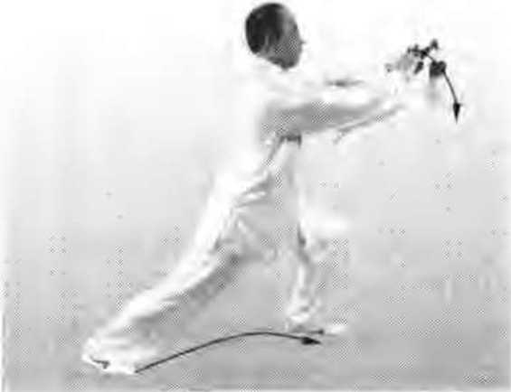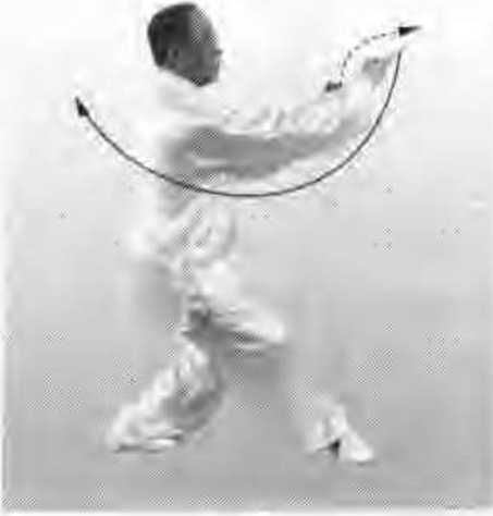 (3)右手边撤边落,经腹前划弧,不可直着向后抽.并注意与身体右 转协调一致。