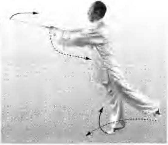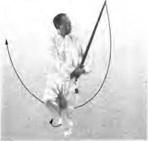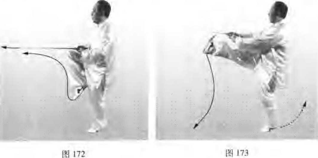 左腿屈膝后坐,重心后移至左腿,右腿屈膝提起,右脚向前躅出.脚 尖11勾.力在脚跟,高于腰部;同时右手持剑,翻手后弓I ;左剑指向下捧托于 行手背下;双手?向前捧剑平刺.高与肩平 眼看剑尖(图172、图173 ):