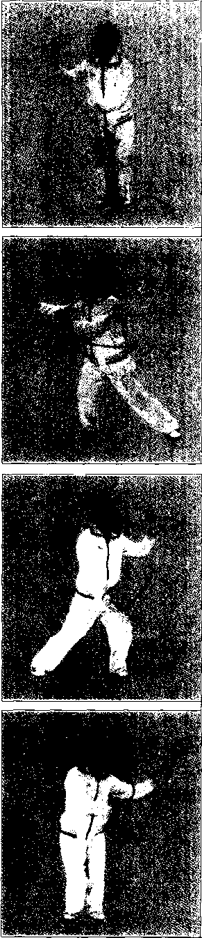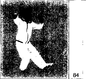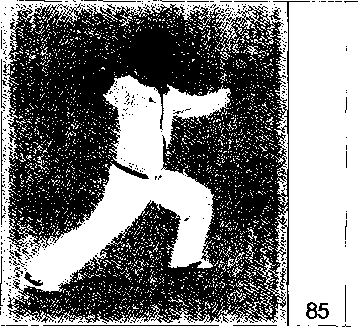 上体左转,重心左移;右脚向左脚并拢, 脚前掌先着地,随之全脚踏实,两腿屈 膝半蹲,两脚平行,脚尖向前,两脚相 距约10厘米;左手经头前向左划弧云 转,掌心渐渐翻转向外。右手向下经腹 前同时向左划弧云转,掌心渐渐翻转向 内;左掌停于身体左侧,高与肩平,右 手停于左肩前;视线随左手转移。
