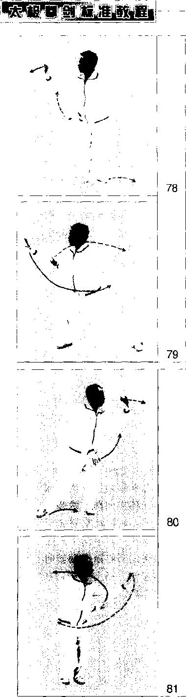 上体左转,重心左移;左脚向右脚并拢, 脚前掌先着地,随之全脚踏实,两腿屈 膝半蹲,两脚平行,脚尖向前,两脚相 距约10厘米;左手经头前向左划弧云 转,掌心渐渐翻转向外;右手向下经腹 前同时向左划弧云转,掌心渐渐翻转向 内。左掌停于身体左侧,高与肩平,右 掌停于左肩前;视线随左手转移。