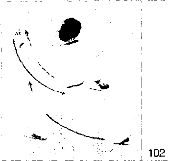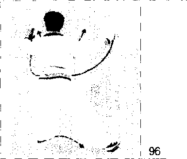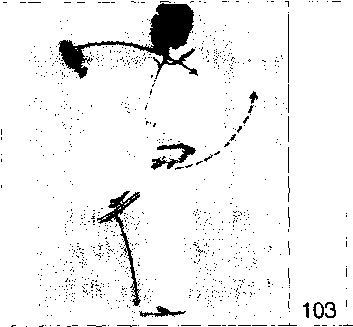 重心移向左腿;左脚尖外撇,左腿屈膝 前弓;右脚尖内扣,右腿自然蹬伸c重 心恢复至弓步高度;左手继续前穿并向 上挑起;右勾手内旋,背尸身后,勾尖 朝匕;眼看左手