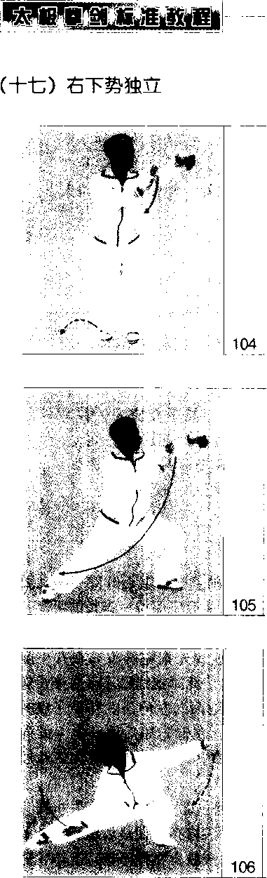 上体右转,重心前移;左腿屈膝前提, 脚尖向下,右腿微屈独立支撑,成右独 立步;右F下落按于右胯旁,左勾手变 掌,经体侧向体前挑起,掌心向右,指 尖向上,高与眼平;左臂半屈成弧,肘 关节与左膝相对;眼看左手。