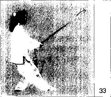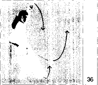 【易犯错误】①第一动落脚方向不对,没有向左后方,而是向后直落步。②向左转体不够, 因而虚步下截动作不能充分利用腰的转动带动挥臂截剑。③右虚步,两脚距离过小,甚至 两脚左右成交错状?