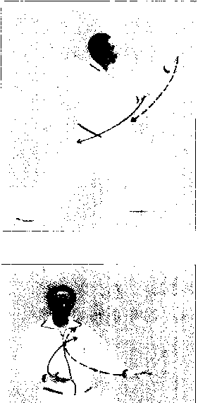 右脚蹬地,左脚提起,上体右转;右拳 变掌,内旋下落;左拳变掌,经腰侧向 前、向上,经右臂内侧穿出,掌心向内 眼向前看: