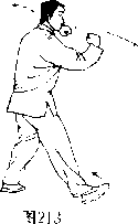 左腿屈膝后坐,身体重心移至左腿,身体左转,右 脚尖里扣;同时两拳变掌,由上向左右划弧分开平举, 乎心向前;眼看左手。(图213、214〉