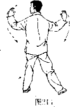两臂左右划弧分开平举,手心均向外撑掌,同时 左脚向左前方慢慢蹬出;眼看左手。(图218〕