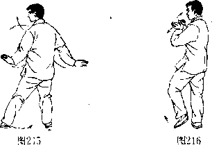 身体重心再移胃至右腿,左脚收到右脚内侧,脚尖 点地;同时两手由外向里划弧合抱于胸前,左手在外, 手心均向后;眼平看左方,(图215,216:!’