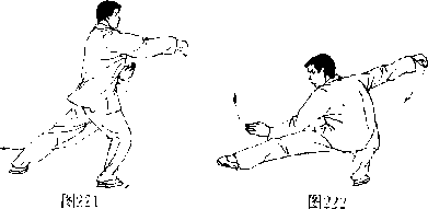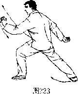 3、弓步挑掌 身体重心前移,左脚 跟为轴,脚尖尽量向外 撇,左腿前弓,右腿后蹬, 右脚尖内扣,上体微向左 转并向前起身;同时左臂 继续向前伸出(立掌〉,掌 心向右,右钩手下落,钩 尖向后;眼看左手。(图 223〕