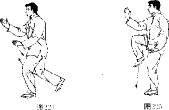 于右腿上方,肘乂膝相对,手心向左,左手落〗:左胯 旁,手心向下.指尖向前;眼看左于^。〈图224、225〉