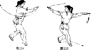 〈1〉徒手练习卜' 肢的上步动作,抬右脚时重心要 充分交至左腿上,而后右腿向前横落。也可结合动作
