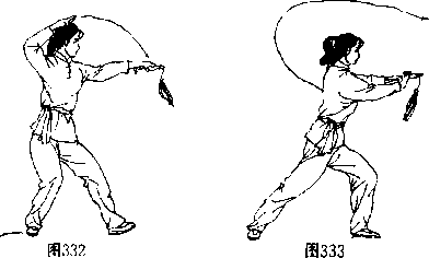 左手持剑稍外旋,手心转向下,剑尖略下垂;左脚 上步成左弓步;同时身体左转,右剑指经头右上方向 前落于剑把上,准备接剑;眼平看前方。(图332,333〕