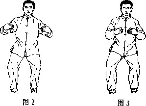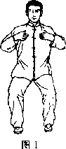 两脚平行分开,同肩宽,两'膝 微屈,重心落于两腿之间;双手臂 微屈,举于胸前,手指微屈自然展 开,指尖相对〈相距约20厘米)掌 心向里如抱球状;目视两手。(图