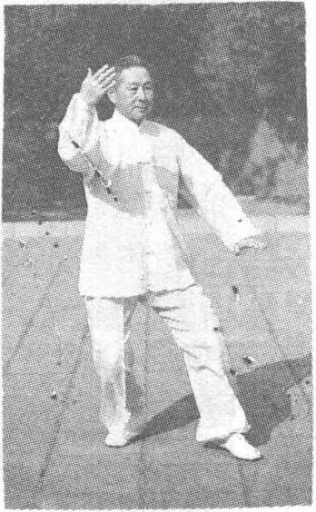 自上式身体重心前移,右足向前跟半步,足尖点地后,足 跟里扣45度踏实。身体重心移于右腿,上体稍向右转,左足 提起,稍前移,足跟落地,足尖翘起,成左虚步;同时,左 掌由左下向上,向前上方挑举,掌心侧向右屈臂垂肘,指尖 向前上方,高与鼻尖平;右掌随腰右转而收回至左肘内侧,掌 心向左,指尖向前上方,眼视左掌(图49)。