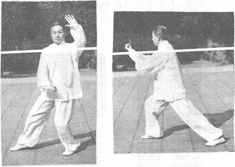 周后向右前斜向15度方向迈出一步,足跟落地,足尖右斜15 度踏实,右腿屈膝,左腿伸展,身体重心前移成右弓步;同 时,右拳随旋臂翻转,向前撇出,拳心向上,腕高与肩平;左 掌由上而下,扶于右肘内侧,眼视右拳(图78)。
