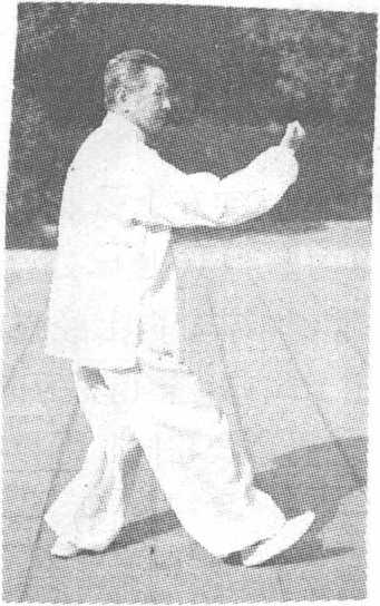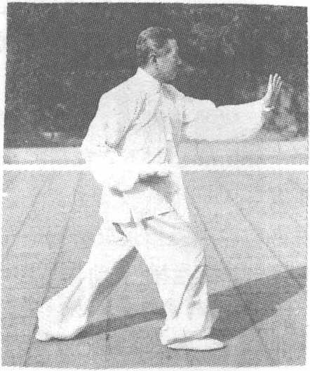 此势不停,左掌经右拳上方 向前推按,掌心向前,指尖向上, 腕高与肩平;右拳变掌,收至腰 右侧,掌心向上,指尖向前,同 时右足尖落地,右腿屈膝,左腿 伸展,体重前移成右弓步,眼平 视左掌上方(图99)。