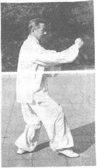 自上式,身体重心后移,右拳上提右前臂横置于胸前,拳 心向下;左掌自左下向前向上划弧上举至额前上方,同时左 足尖翘起,里扣135度,身体随之右转,重心再移于左腿;右 足收回随即向右前方迈出,足跟落地,同时右拳向胸前撇出, 拳心向上,肘部下垂,左掌下落抚于右前臂内侧,掌心向下, 76