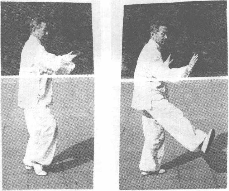 自上式,身体重心后移,右腿屈膝,左腿伸展,左足尖 翘起,向里扣135度,上体随之右转,身体重心再移至左腿 上;随即提起并收回右足,再向右侧方向迈出一步,踏实屈 膝,左腿伸展,身体重心前移成右弓步,同时两拳变掌,下 79