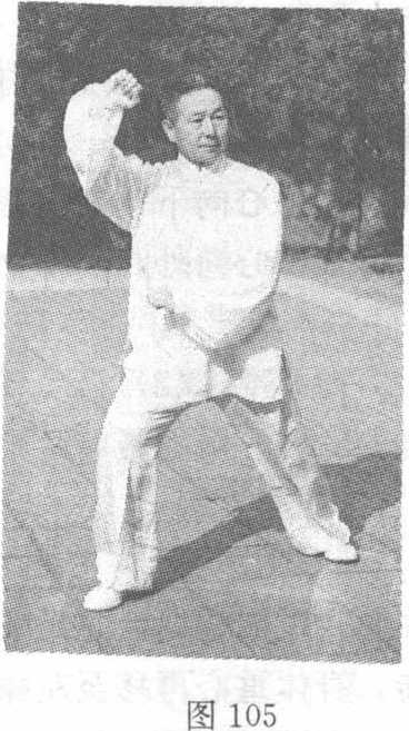 落经腹前向右划弧,左掌握拳,屈 臂上提至右胸前,拳心向下,右 掌握拳经身体右侧上举至右额前 上方,拳心向外,两拳上下相对, 眼平视左前方(图105)。