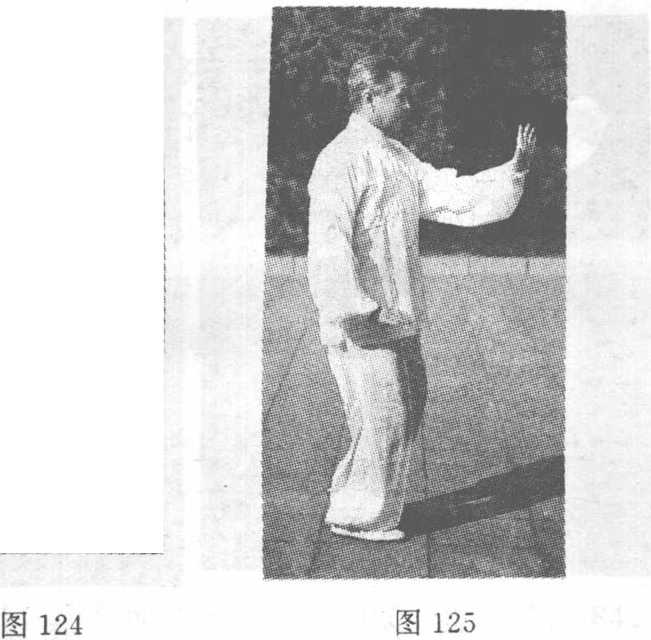 上式完成后,右足后撤半步,全足踏地落实,身体重心 移于右足,提起左足后撤于右足旁,足尖点于右足跟内侧约 10厘米处成左丁字步;同时左掌挑起,向前向上伸举于胸前, 掌心斜向右,指尖向上,腕高与肩平,右掌下落,按于右胯 前侧,掌心而下,指尖向前,眼视左掌方向(图125)。