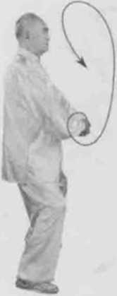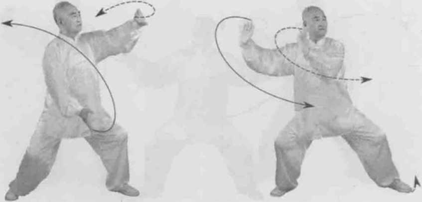 动作四身体左转,胸向东眼看左前。左脚顺缠外摆转右脚顺缠膝里合,重心偏右腿。左掌顺缠前上搠右掌逆缠右捋转。