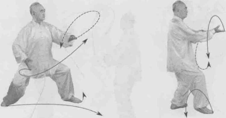 动作一身体右转胸向西南眼看左前。左脚顺缠膝里合右脚逆缠膝