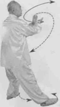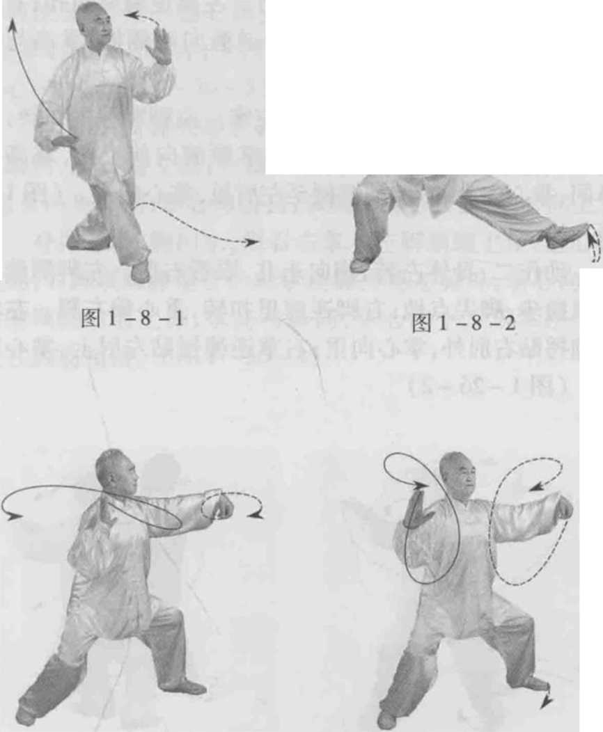 身体左转胸向东北眼看前方。左脚顺缠划后弧跟步脚尖点地右脚顺缠膝里合突出右胯重心偏右腿°左掌顺缠捋至左胯外掌心向下右掌逆缠向右上搠掌高与耳同掌心向右。(图1一7-4)