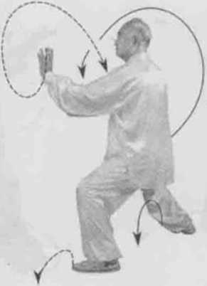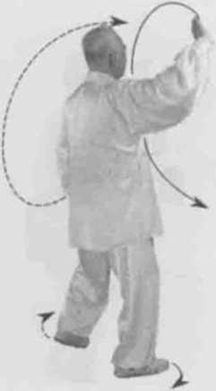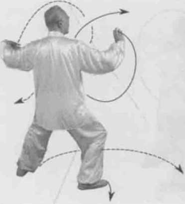 身体快速右后转胸向西眼看左掌。左脚逆缠里扣转变里跟转