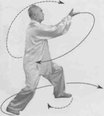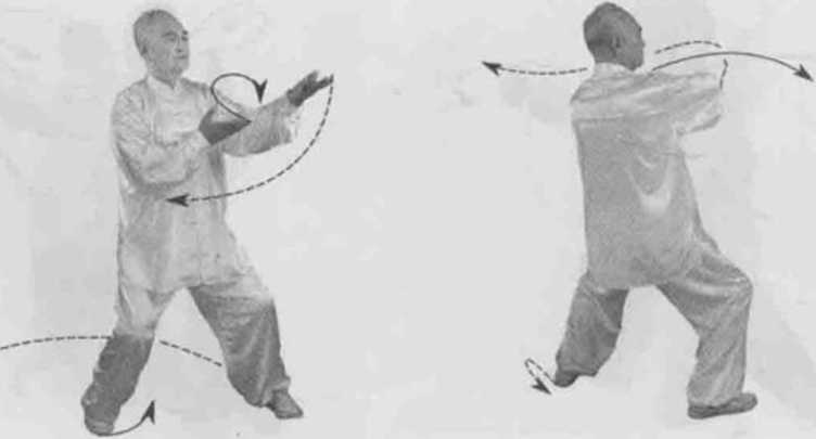 动作二身体左转胸向东北眼看右肘外。左脚逆缠膝里扣右脚逆缠里扣转重心偏右腿。左掌逆缠搠转右掌顺缠捋转。