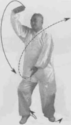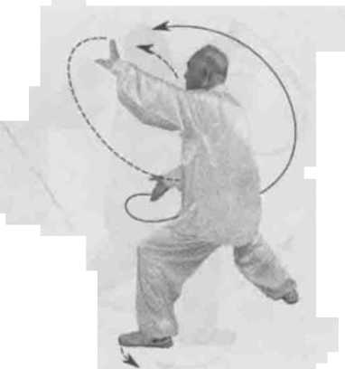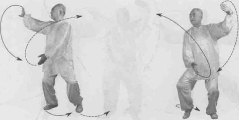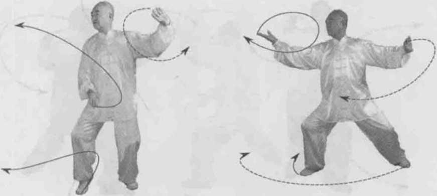 动作一身体快速右转胸向西南眼看前方。左脚顺缠膝里合右脚顺缠外跟转脚尖点地,重心偏右腿。左掌顺缠按转右掌逆缠探转。