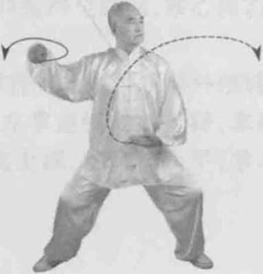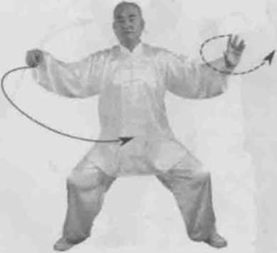 身体右转,胸向北眼看左侧。左脚顺缠膝里合右脚逆缠膝里扣,重心偏右腿。左掌顺缠捋至腹前掌心向右右掌逆缠搠至右胯外掌心向下。