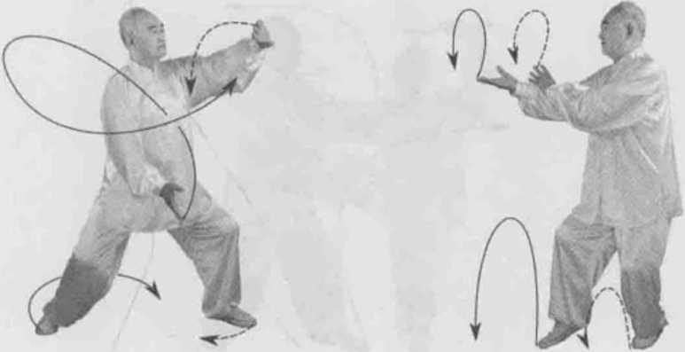 动作一身体右转,胸向南眼看左侧。左脚顺缠膝里合右脚逆缠膝里扣重心偏右腿。左掌顺缠右捋转右勾手变掌逆缠搠转。