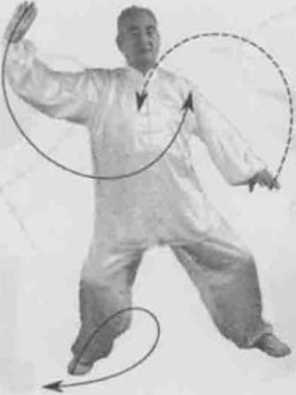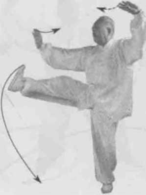 动作一身体左转,胸向西眼看双掌。左脚逆缠膝里扣,重心在左腿右脚逆缠提膝。左掌顺缠探贴右肘掌心向上右掌顺缠向前上揉掌高与鼻同掌心向上。