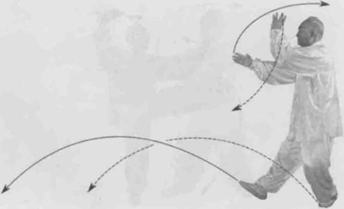 身体快速左转胸向西南眼看右掌。左脚逆缠膝里扣,重心在左腿右脚逆缠向胸右前蹬。左掌逆缠向左上捋掌高过头顶掌心向上右掌逆缠向右前上搠掌高与眼同掌心向前。(图1-53-1)