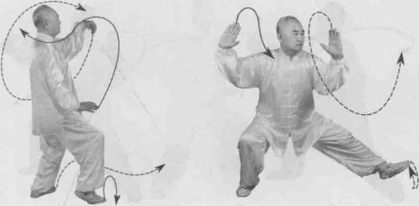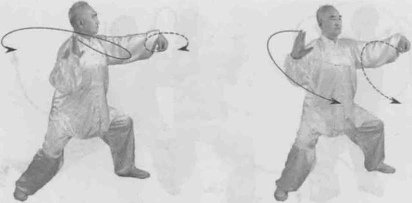 动作一身体快速左转胸向东北眼看右掌。左脚逆缠膝里扣重心偏左腿右脚顺缠膝里合。左拳变掌逆缠捋转右拳变掌顺缠搠转。