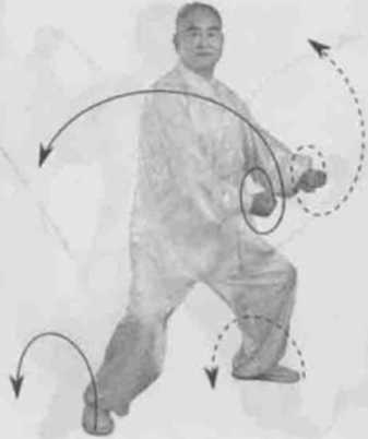 身体右转,胸向东眼看前方。左脚顺缠膝里合右脚逆缠膝里扣,重心偏右腿。左掌顺缠向腹前搠掌心向右右掌逆缠捋至左肩前掌心向左。