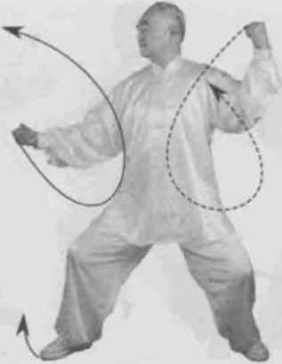 动作一身体右转胸向东南眼看右拳。左脚顺缠膝里合右脚逆缠膝里扣重心偏右腿。左勾手变拳顺缠捋转右掌变拳逆缠搠转。