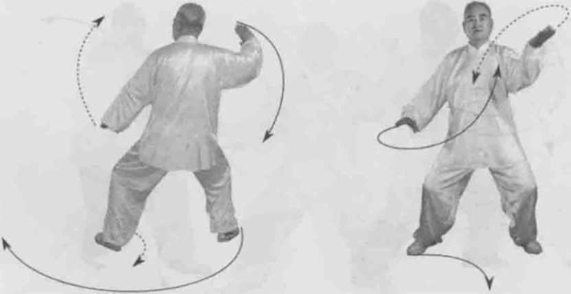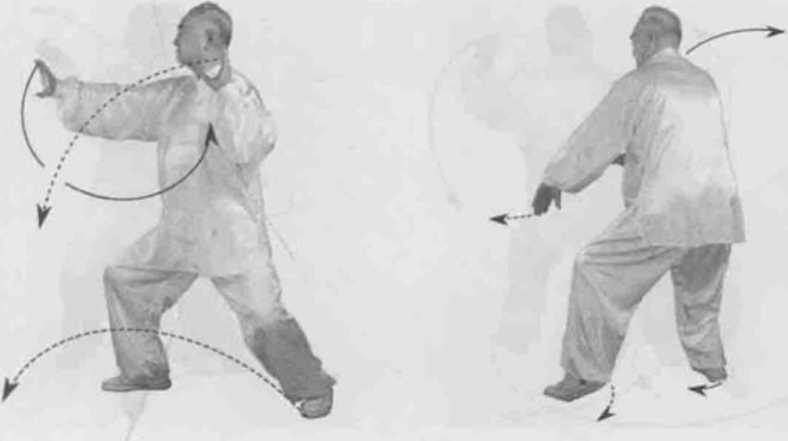 身体右转,胸向西眼看右掌。左脚顺缠膝里合右脚顺缠外摆转