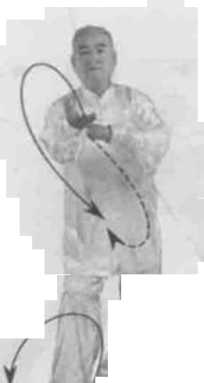 动作一身体右转,胸向北眼看左掌。左脚逆缠里跟转脚跟落地发劲同时右脚顺缠外跟转脚跟落地发劲,重心偏右腿。左掌逆缠向左胯外搠发劲。掌心向下右掌逆缠向右上捋发劲掌高与眼同掌心向右。(图2-11-1)