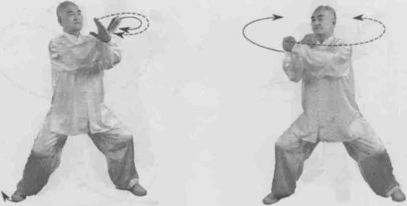 动作一身体左转,胸向南眼看右拳。左脚逆缠膝里扣,重心偏左腿右脚顺缠膝里合。左拳逆缠捋转右拳顺缠搠转。