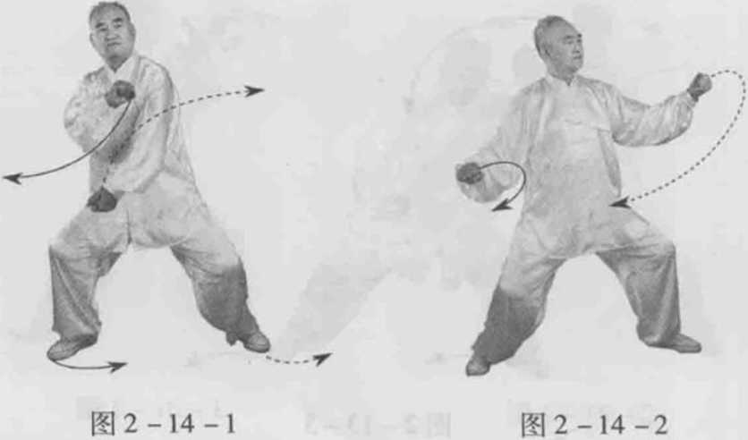 身体快速右转胸向南眼看左侧。左脚逆缠跳起开步同时右脚顺缠跳起并步重心偏右腿。左拳顺缠搠至腹前拳心向右右拳逆缠捋至左肩前拳心向左。(图2-14-1)