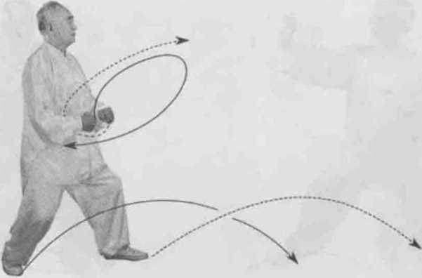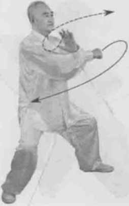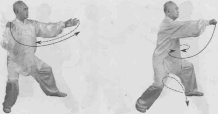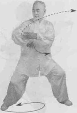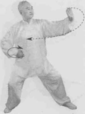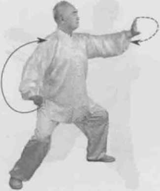 动作一身体快速左转胸向东北眼看右前。左脚逆缠膝里扣右脚顺缠膝里合,重心偏右腿。左掌顺缠按转右掌变拳顺缠按转。