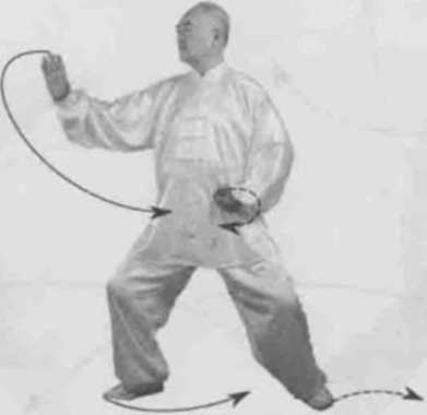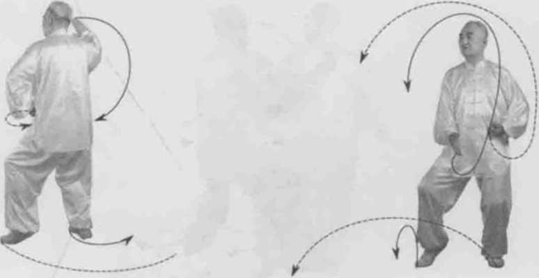 动作一身体右转胸向西南眼看右掌。左脚逆缠退步右脚逆缠膝里扣,重心偏右腿。左拳逆缠左捋转右掌逆缠搠转。