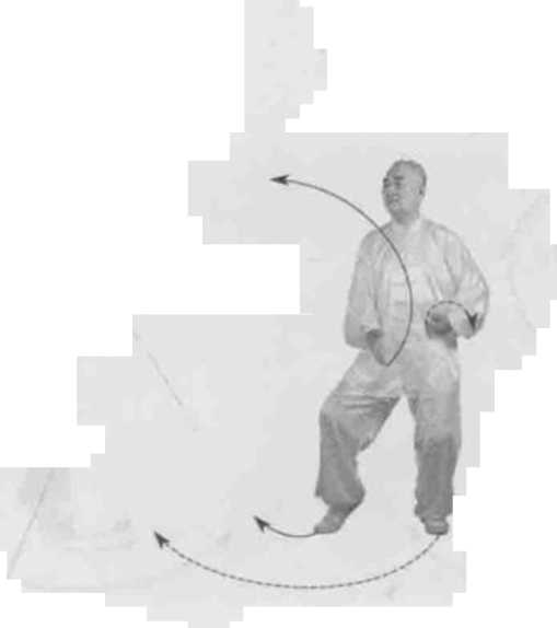 身体快速左转胸向东北眼看右掌。左脚顺缠跳起身腾空右脚逆缠先向前跳起。左拳逆缠捋贴左肋拳心向里右掌逆缠向右前上搠掌高与眼同掌心向前。